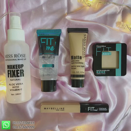 Miss Rose makeup kit, 5-item makeup bundle, tube foundation, makeup fixer spray, high-coverage concealer, face powder, makeup primer, long-lasting makeup, flawless makeup base, complete makeup set, makeup essentials, professional makeup kit, makeup reviews, all-in-one makeup set.