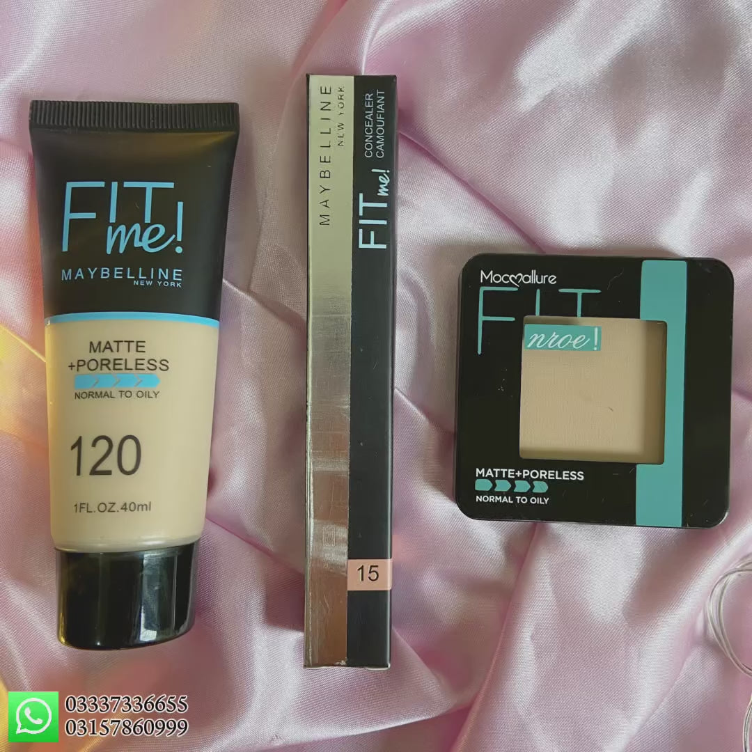 Achieve a flawless, radiant look with the Maybelline 3 pcs Set, featuring a tube foundation, concealer, and face powder. This essential trio provides everything you need for a complete, long-lasting makeup base, perfect for everyday wear or special occasions.